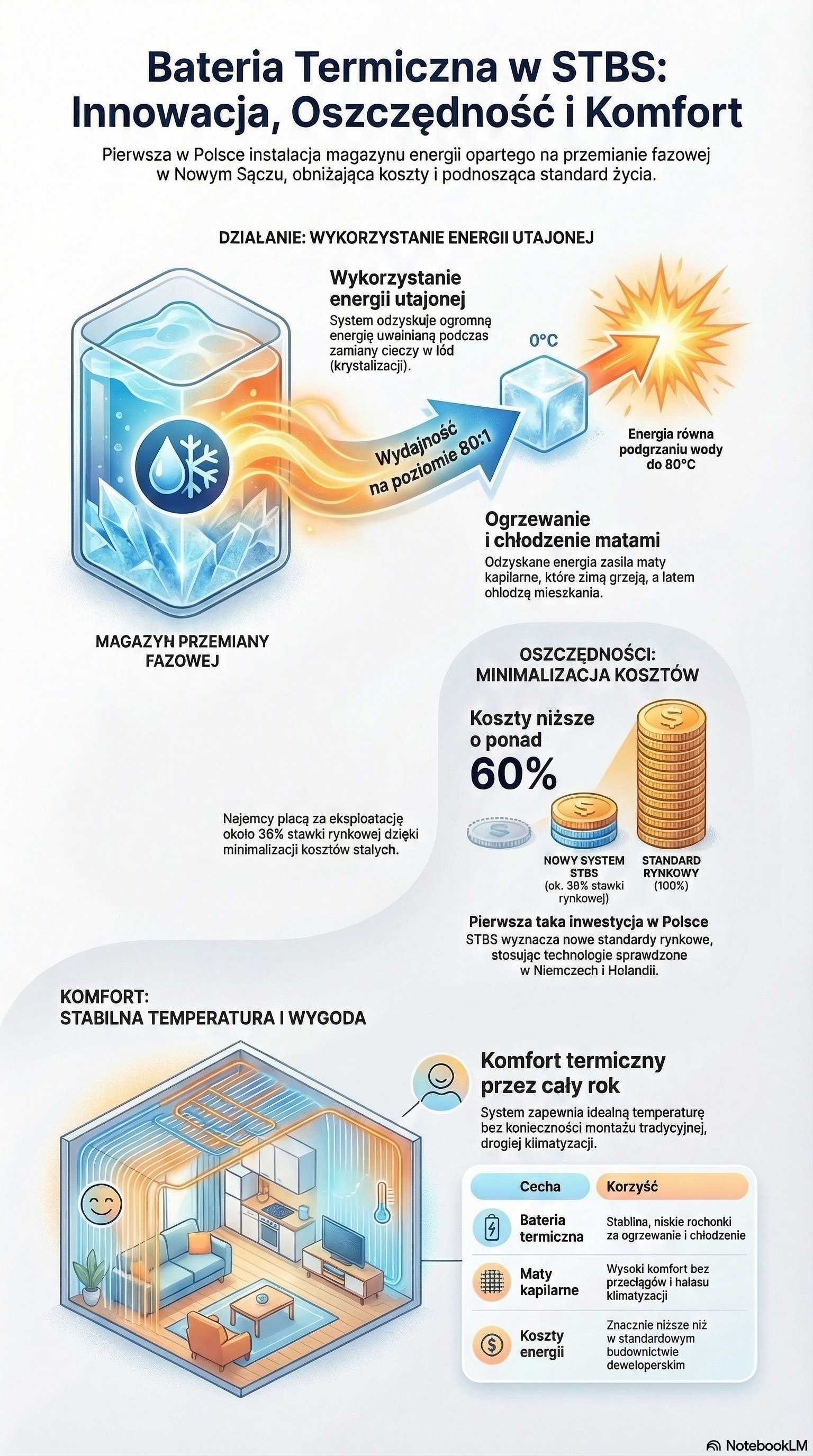 Sądeckie Towarzystwo Budownictwa Społecznego (STBS) po raz kolejny udowadnia, że budownictwo społeczne może być synonimem nowoczesności i ekologii. W ramach nowej inwestycji przy ul. 29 Listopada w Nowym Sączu, spółka wdraża rozwiązanie pionierskie w skali całej Polski – magazyn energii oparty na baterii termicznej wykorzystującej przemianę fazową. To technologia, która ma realnie wpłynąć na komfort życia lokatorów i, co najważniejsze, na wysokość ich rachunków.
